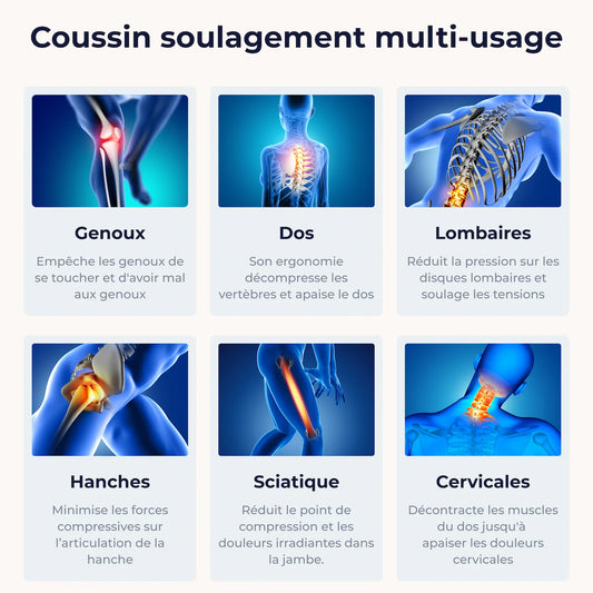- Les coussins ergonomiques sont designés pour corriger la posture d'assise, réduisant la pression sur la région anale ainsi que les douleurs dorsales.